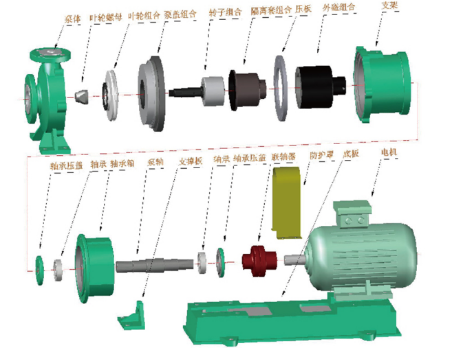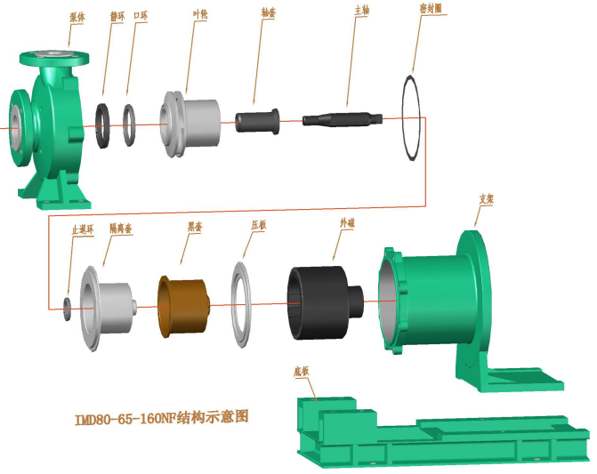 針對(duì)傳統(tǒng)襯氟磁力泵存在的問(wèn)題,我公司(安徽南方化工泵業(yè))組織技術(shù)攻關(guān),多次與用戶進(jìn)行技術(shù)交流,開(kāi)發(fā)出了如圖所示的新型磁力泵: