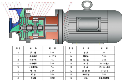 CQ型為輕型,其組成部分配置很低,軸承止推盤為石墨材料,不耐磨,使用壽命短,磁材為鐵氧體,磁性較弱,對(duì)比重大的介質(zhì)無(wú)法使用。